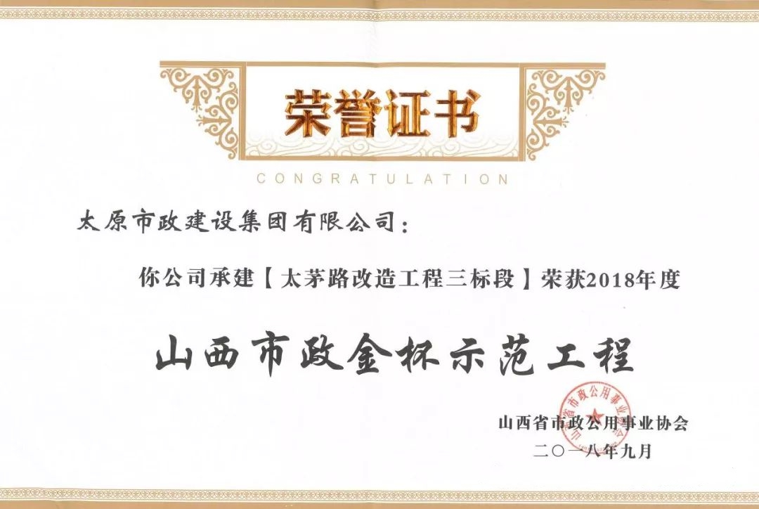 太原市政建設(shè)集團(tuán)有限公司多項(xiàng)工程喜獲山西省市政金杯示范工程榮譽(yù)稱號(hào)