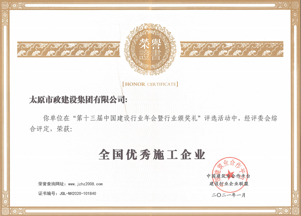 2021年1月,中國建筑業(yè)合作平臺建設(shè)行業(yè)企業(yè)聯(lián)盟召開“第十三屆中國建設(shè)行業(yè)年會暨行業(yè)頒獎禮”,會上,集團公司榮獲“全國優(yōu)秀施工企業(yè)”榮譽稱號。
