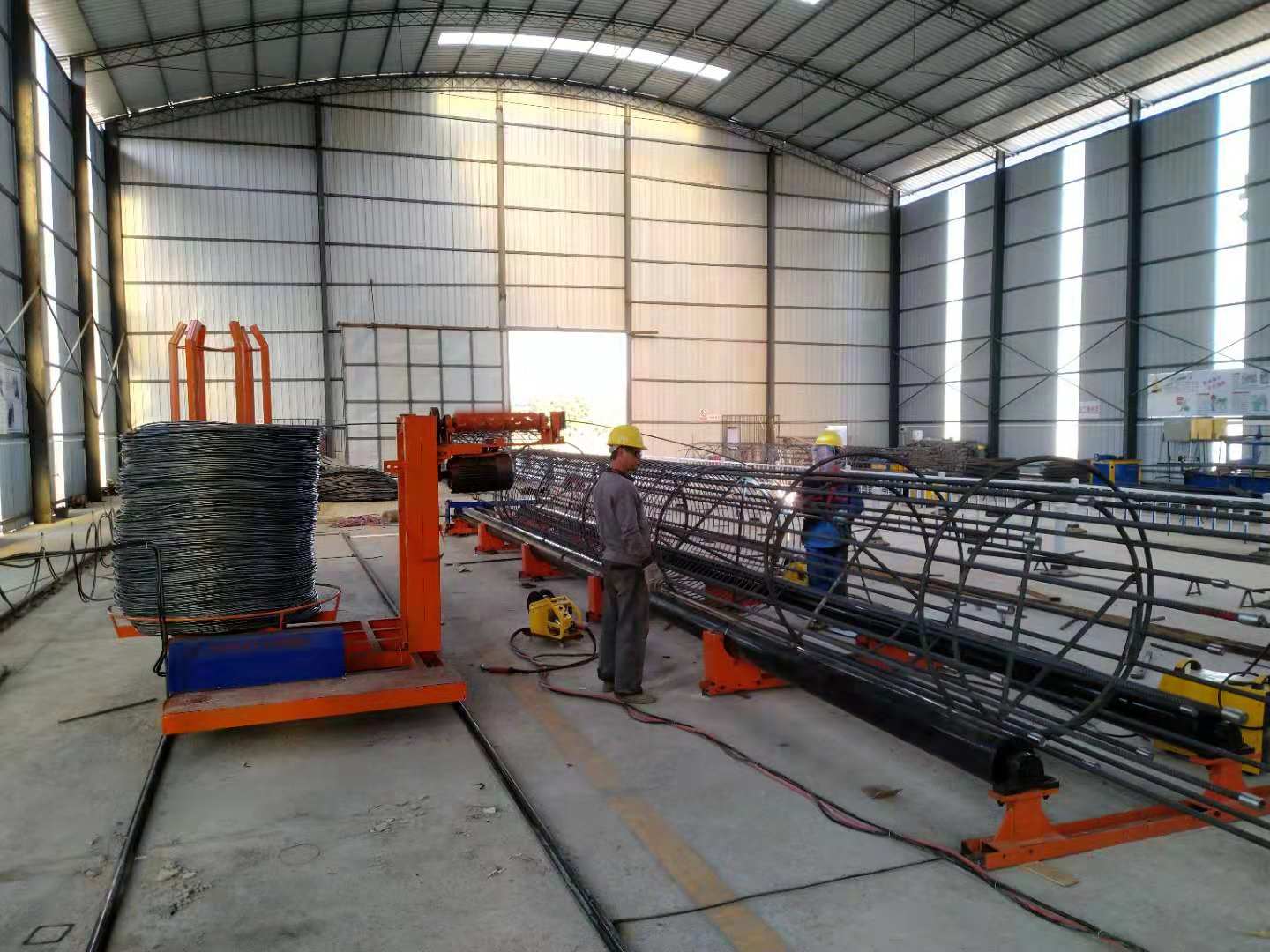正常情況4人一班,分二班作業(yè),8個(gè)人一天就可以加工出40多個(gè)12米長(zhǎng)成品的籠子,使用工作效率非常高。由于主筋在其圓周上分布均勻,多個(gè)鋼筋籠搭接時(shí)很方便,節(jié)省了吊裝時(shí)間。